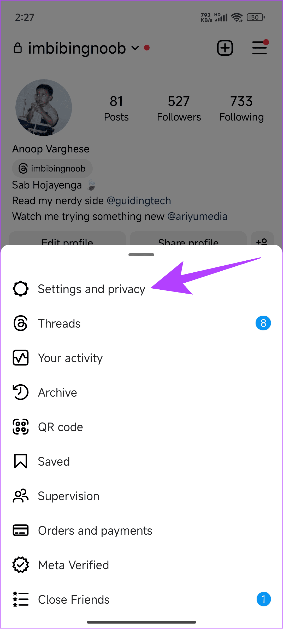 步骤一:打开Instagram→个人资料图片→汉堡菜单→设置和隐私.