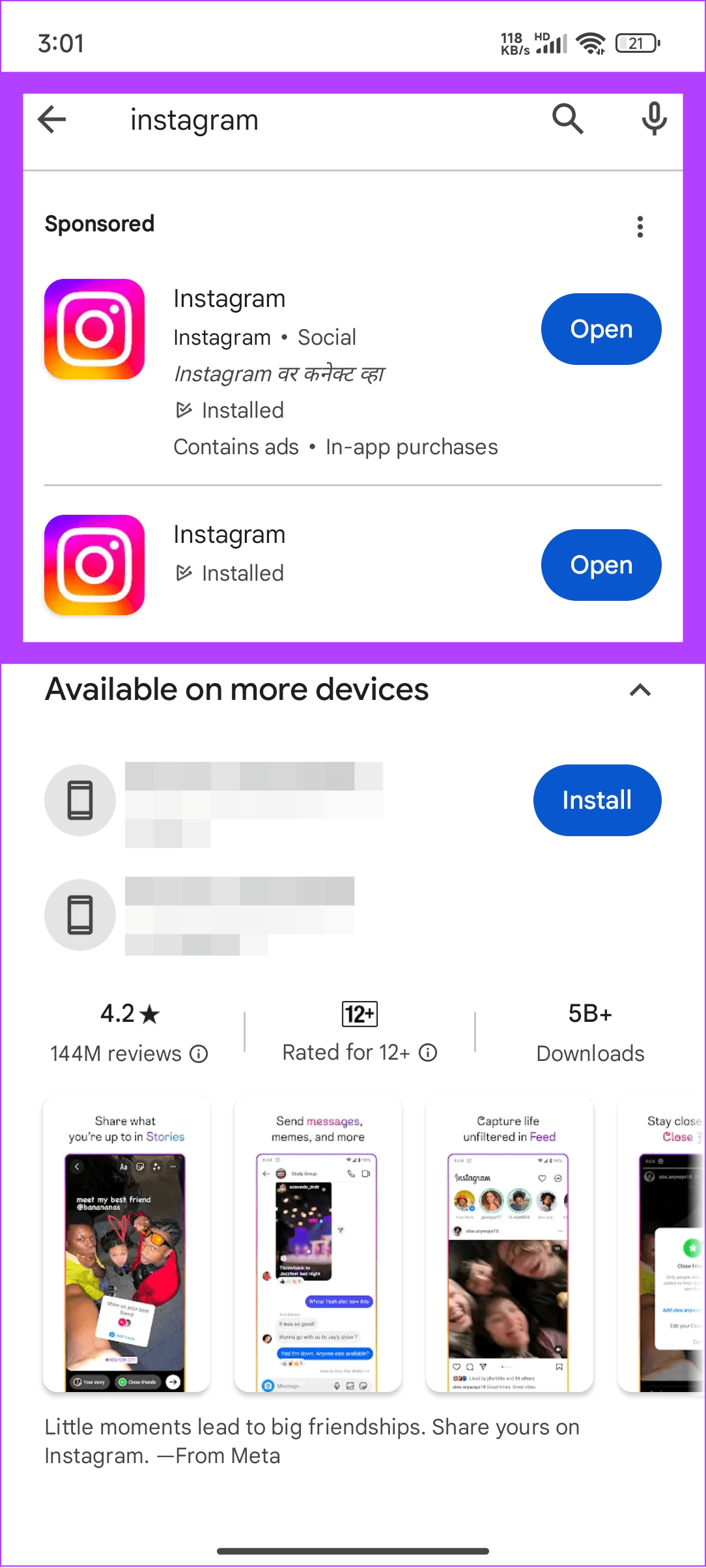 步骤一:打开Play 商店, 搜索Instagram,然后打开应用程序页。