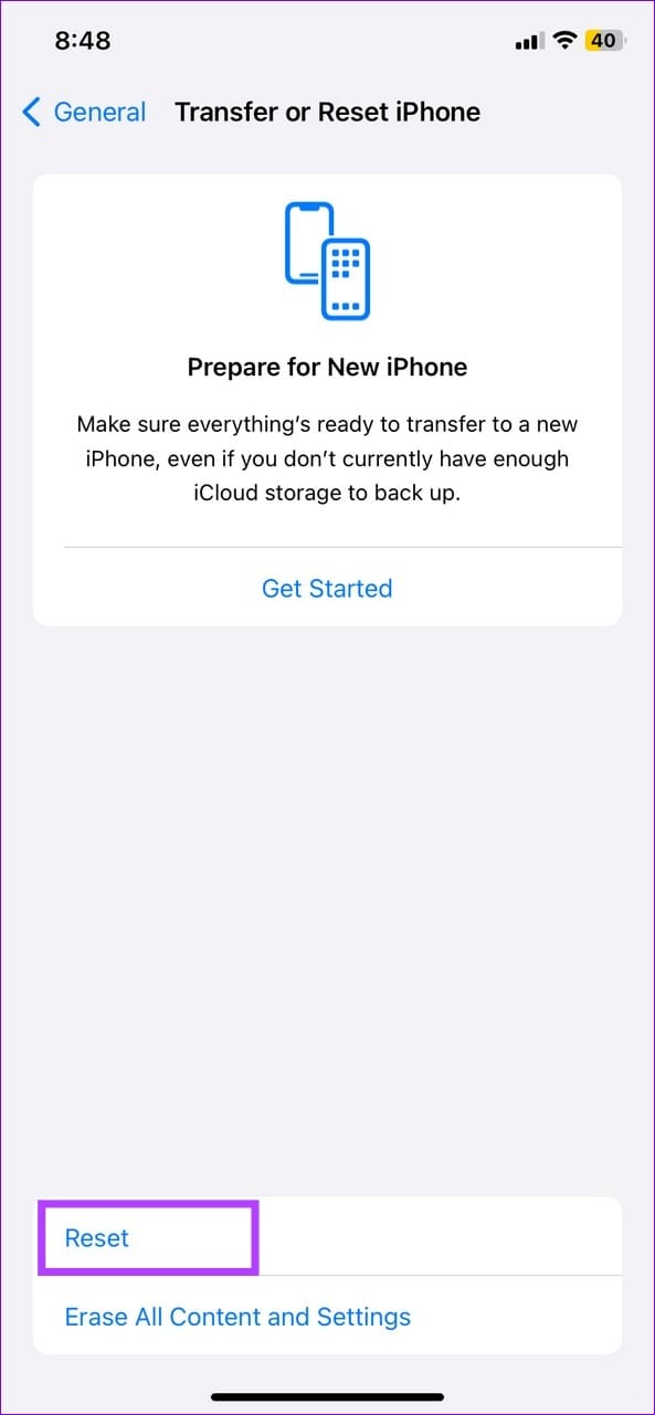 步骤3:向下滚动到底部,然后选择转移或重置 iPhone.