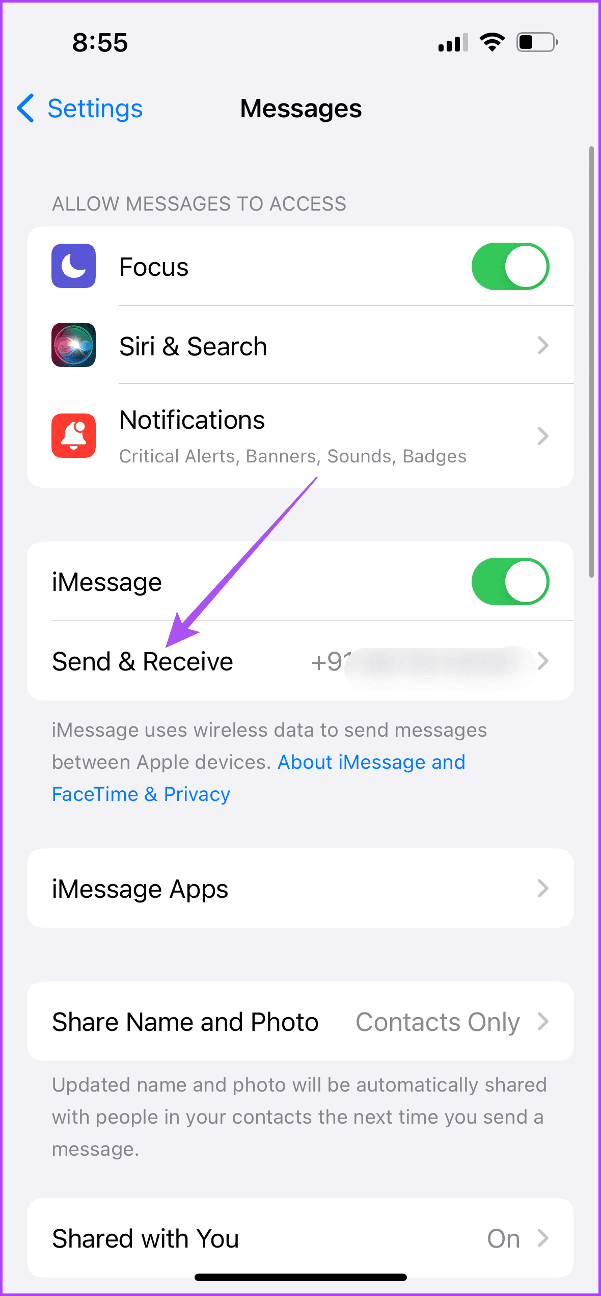 步骤2:关闭开关短信。然后,几秒钟后再次启用它。点击发送和接收选择您的电话号码。
