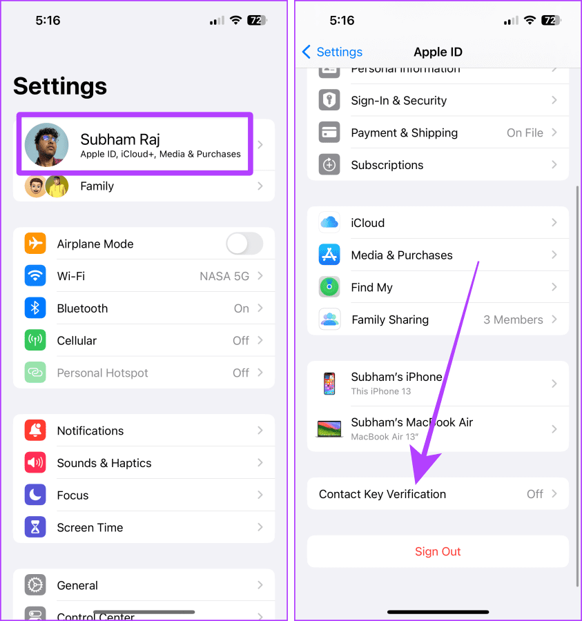 步骤2:在 Apple ID 设置中向下滚动,然后点击联系人密钥验证。