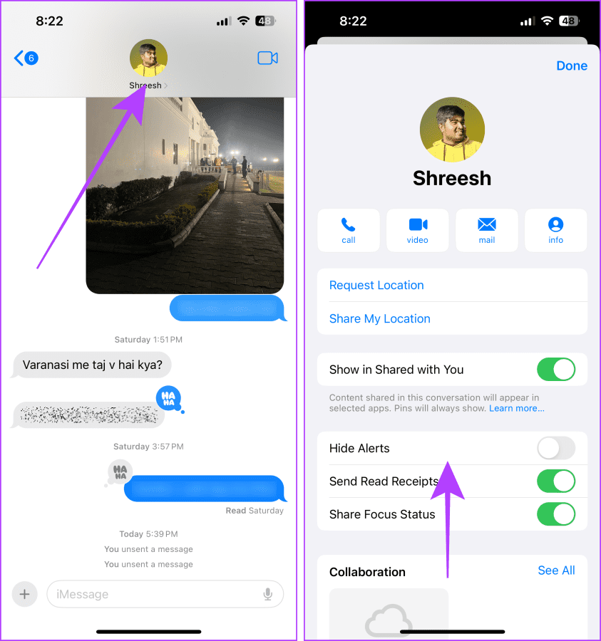 步骤1:打开您想要验证的联系人的 iMessage 聊天,然后点击他/她的个人资料照片。