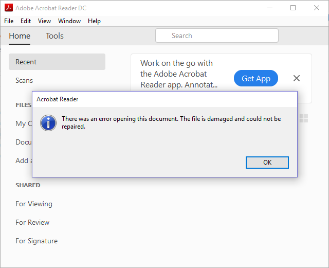 下图是当我尝试打开损坏的 PDF 文件时 Acrobat Reader 显示的消息。