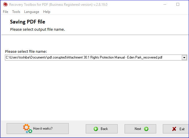 4. 指定输出文件名。通常情况下,软件会将恢复的文档保存到与原始文件相同的文件夹中的新PDF文件中,并且与源文件同名,但末尾带有“已恢复”字样。但你也可以改变这一点。