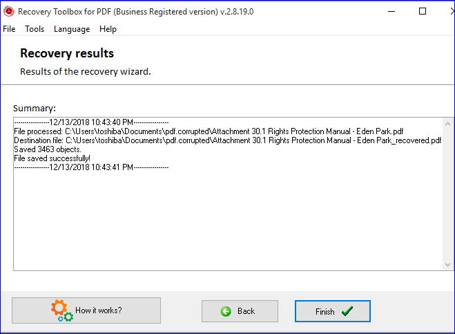 就是这样!您现在已经修复并恢复了损坏的 PDF 文件。单击完成退出并关闭程序。现在打开恢复的文档以查看恢复内容的性质。这是我们恢复的 PDF 文件的样子。