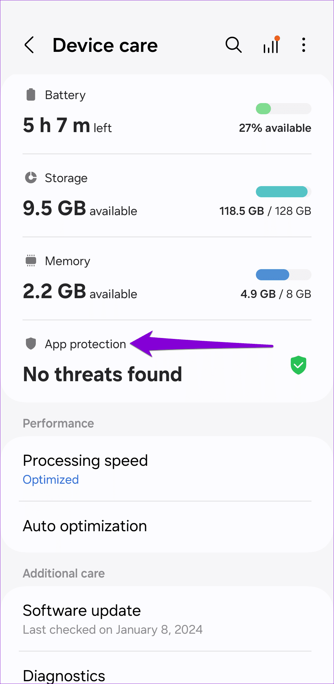 如果您的三星 Galaxy 手機感染了惡意軟體,也可能會出現此類問題。若要排除這種可能性,請使用裝置維護功能掃描手機中是否有惡意軟體。