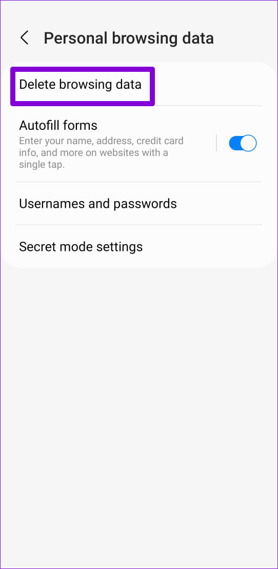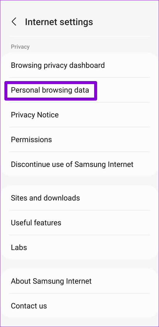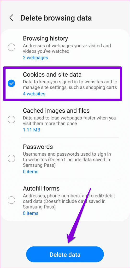 三星互聯網儲存的現有 cookie 和網站資料可能會導致其有時行為不當並打開隨機網站。您可以嘗試清除現有的瀏覽器數據,看看能否解決問題。