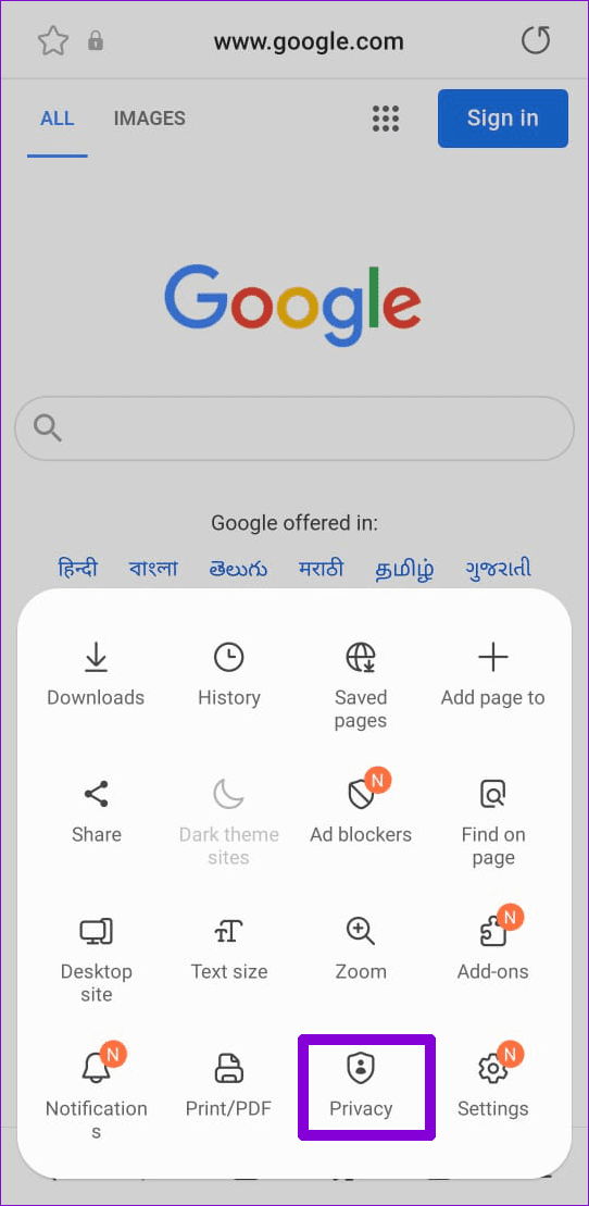 步驟一:在三星網路瀏覽器中,點選選單圖示(三條水平線)位於右下角並選擇隱私.