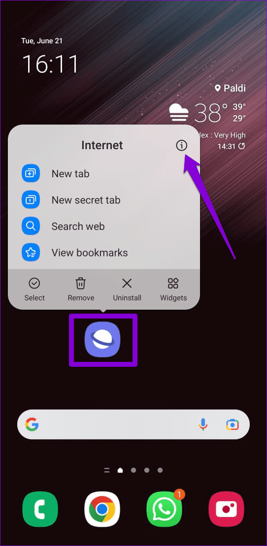 步驟一:長按三星網路應用程式圖標> 點選資訊圖示從選單中。